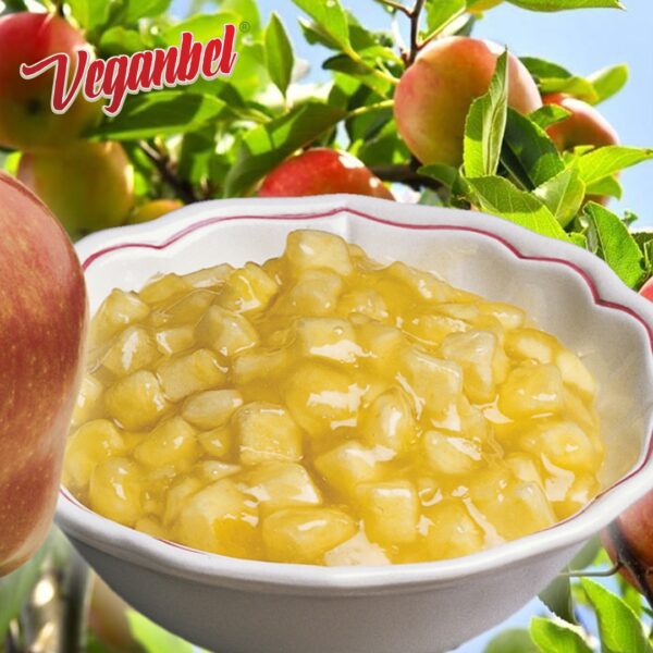VEGANBEL FRUIT MELA è mela tagliata a cubetti dispersi in una cremosa e lucente gelatina, che sostituisce confetture e marmellate perché ricca di gradevole frutta (70%), morbida e bella da vedere!